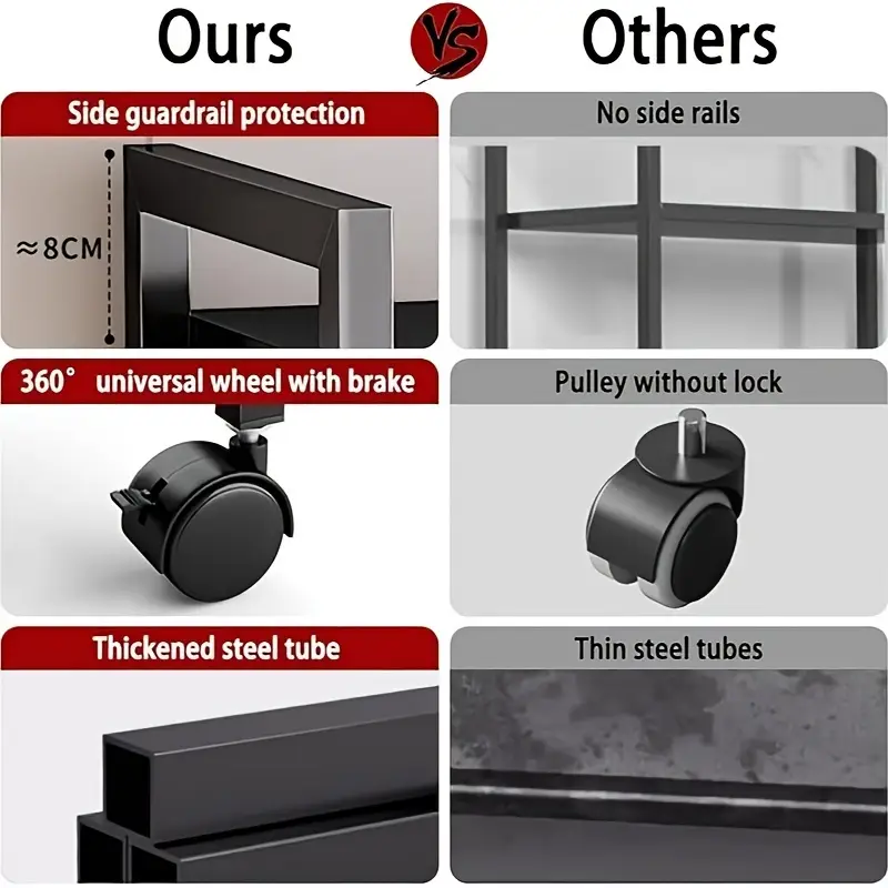 Its adjustable shelves provide the flexibility to customize storage spaces for items of different sizes, making it suitable for use in the kitchen, pantry, bathroom, garage, or closet. Equipped with sturdy wheels, this floor-mounted shelf is easy to move, ensuring effortless repositioning whenever needed. With a load-bearing capacity of up to 50 kg, it supports heavy items while maintaining stability.