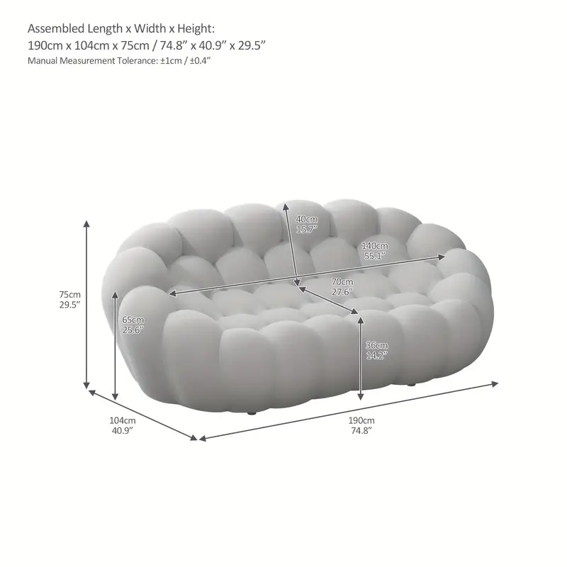 This modern piece is not only visually appealing but also highly functional. Its non-electric operation means no extra hassle—just simple relaxation. The versatile design makes it suitable for various room types, from living spaces to offices, and its lightweight nature ensures it can be easily moved around as needed. The 74.8” length offers ample seating space, and the soft cushioning provides ultimate comfort for lounging or casual seating. Whether you’re looking to enhance a home or professional setting, this modern bubble floor couch delivers style, comfort, and durability.
