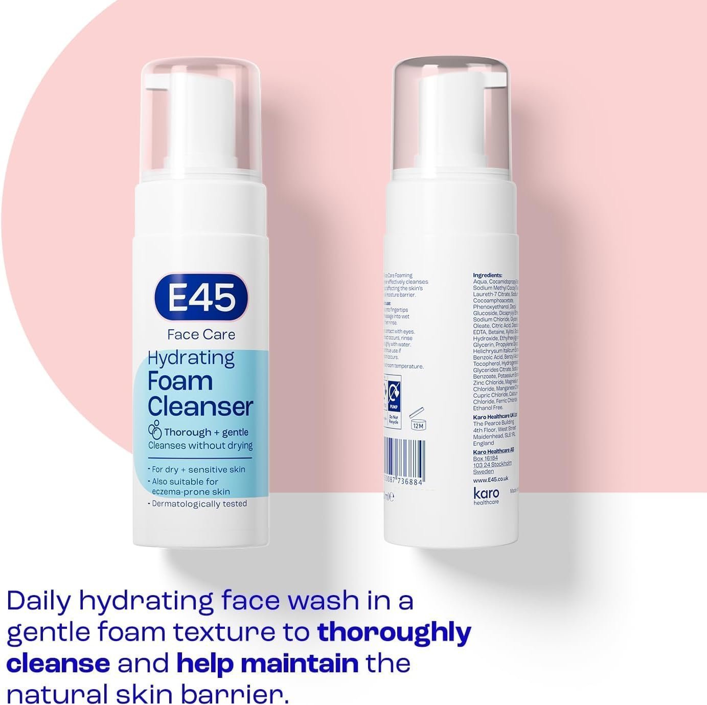 - HOW TO USE – Pump the cleanser onto the fingertips and massage into wet skin, then rinse. Use twice a day: morning and night and we recommend using the E45 Face Moisturiser after for long-lasting softness. The E45 Face Foaming Cleanser has been specially formulated to be used on dry and sensitive skin. Also suitable for those prone to eczema and dermatitis.