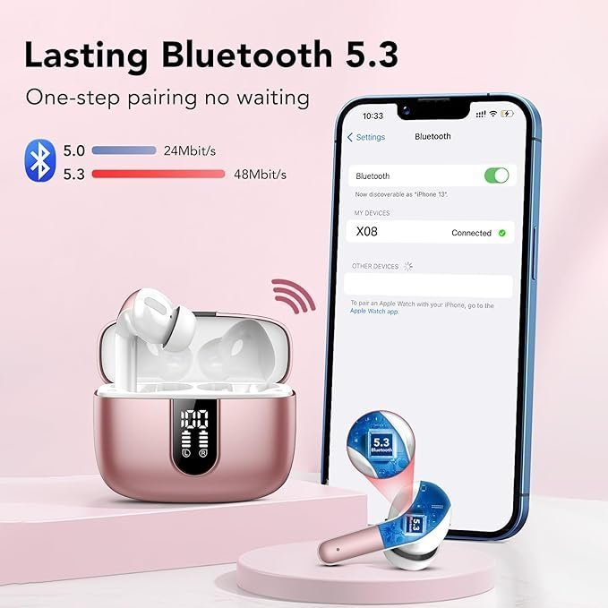 • Upgraded Bluetooth 5.3: The bluetooth earphones is equipped with an advanced bluetooth 5.3 chip and dual-channel transmission. 0.06s low latency and 200% better signal stability. Compatible with iOS and Android.